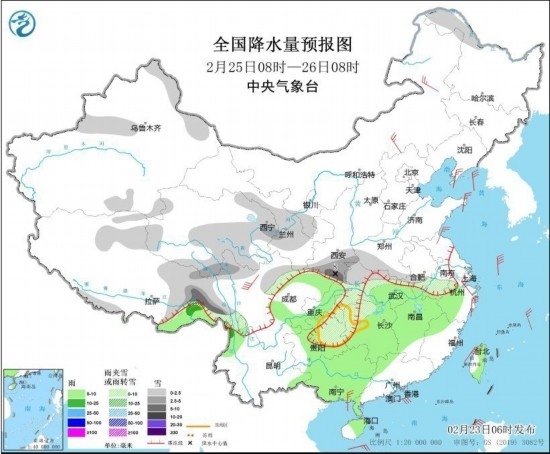 全國降水量預(yù)報圖(2月25日8時-26日8時)