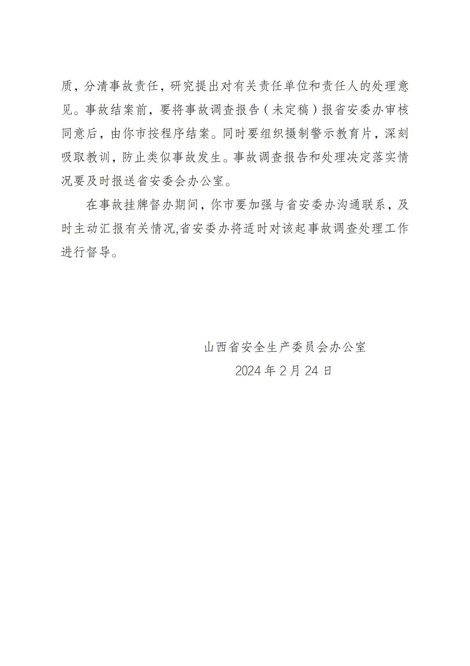 根據(jù)《國務(wù)院關(guān)于進一步加強企業(yè)安全生產(chǎn)工作的通知》《山西省較大事故查處掛牌督辦辦法》等有關(guān)規(guī)定要求,山西省安委辦決定對該起事故查處實行掛牌督辦。要求呂梁市依據(jù)有關(guān)法律法規(guī)和規(guī)定,組織進行事故調(diào)查,查明事故原因,認定事故性質(zhì),分清事故責(zé)任,研究提出對有關(guān)責(zé)任單位和責(zé)任人的處理意見。事故結(jié)案前,要將事故調(diào)查報告報山西省安委辦審核同意后,由呂梁市按程序結(jié)案。同時要組織攝制警示教育片,深刻吸取教訓(xùn),防止類似事故發(fā)生。事故調(diào)查報告和處理決定落實情況要及時報送山西省安委辦。