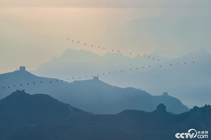 3月7日,河北承德,遷徙的候鳥飛過(guò)金山嶺長(zhǎng)城上空。