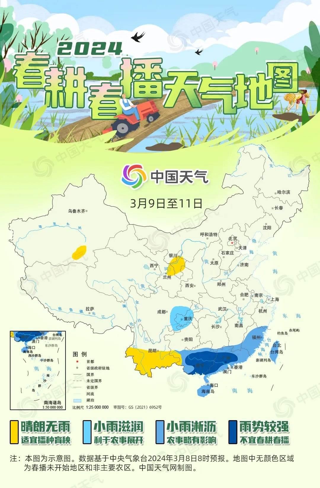 “微雨眾卉新,一雷驚蟄始。田家?guī)兹臻e,耕種從此起。”到了驚蟄時(shí)節(jié),我國(guó)春耕春播工作已陸續(xù)展開(kāi),從華南到西北,田間地頭逐漸忙碌了起來(lái)。一年之計(jì)在于春,春耕春播工作對(duì)于全年糧食豐收至關(guān)重要。中國(guó)天氣網(wǎng)推出2024全國(guó)春播進(jìn)程圖和春耕春播天氣地圖,看各地春播何時(shí)展開(kāi),近期春播天氣如何。