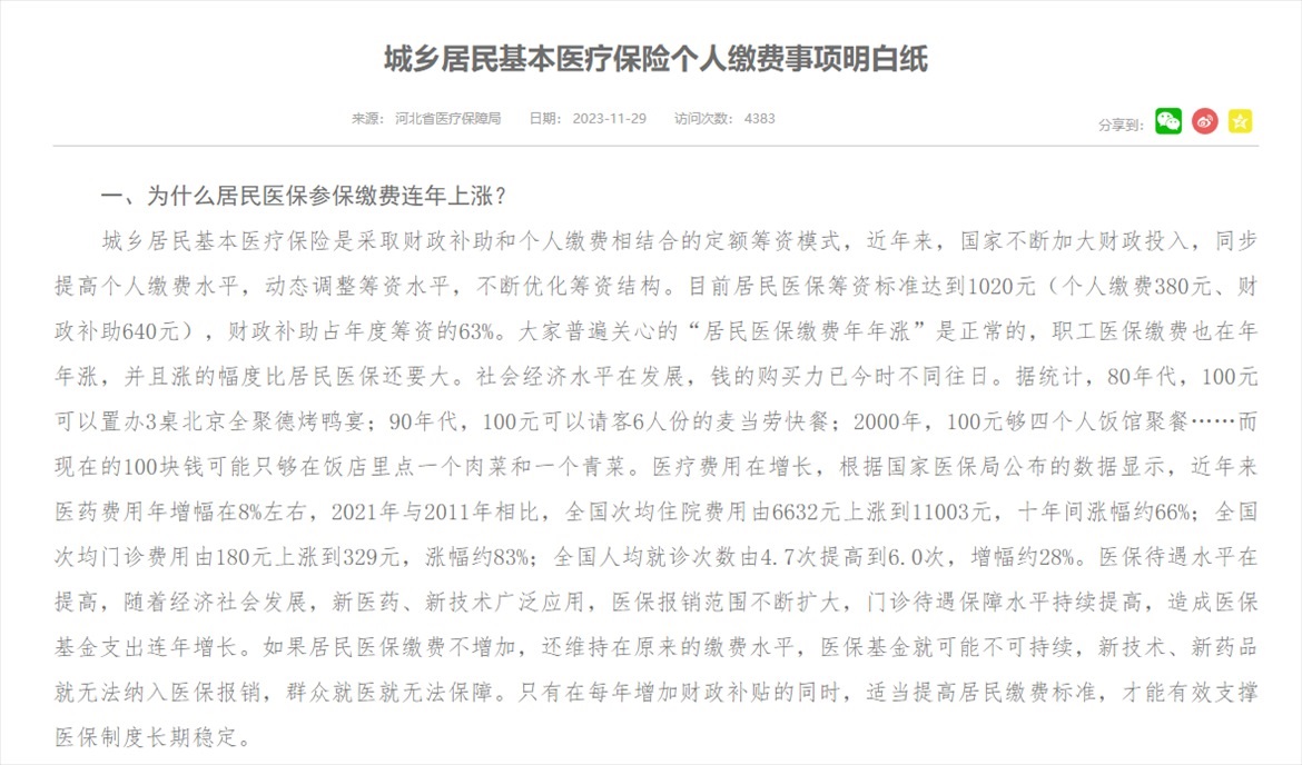記者注意到,河北省醫(yī)保局去年11月份曾發(fā)布《城鄉(xiāng)居民基本醫(yī)療保險個人繳費事項明白紙》,其中就“為什么居民醫(yī)保參保繳費連年上漲?”問題回應稱:“大家普遍關心的‘居民醫(yī)保繳費年年漲’是正常的,職工醫(yī)保繳費也在年年漲,并且漲的幅度比居民醫(yī)保還要大。社會經(jīng)濟水平在發(fā)展,錢的購買力已今時不同往日,醫(yī)療費用在增長,醫(yī)保待遇水平在提高。如果居民醫(yī)保繳費不增加,還維持在原來的繳費水平,醫(yī)?;鹁涂赡懿豢沙掷m(xù),新技術、新藥品就無法納入醫(yī)保報銷,群眾就醫(yī)就無法保障。”
