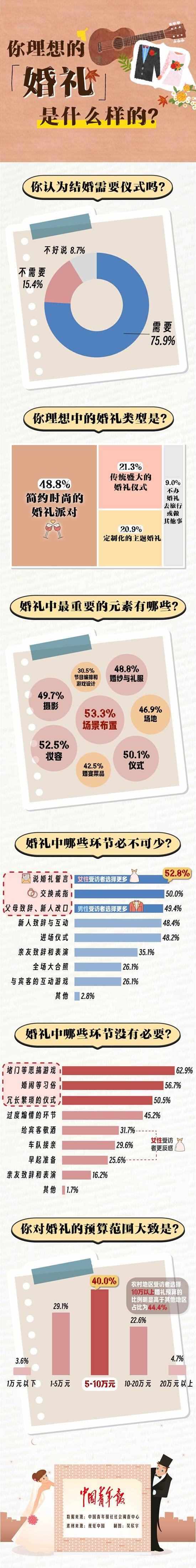 調(diào)查中,有75.9%的受訪青年認(rèn)為“結(jié)婚需要儀式”。64.2%的受訪青年認(rèn)為極簡(jiǎn)婚禮的流行是年輕人追求個(gè)性化和自由的體現(xiàn),61.6%的受訪青年認(rèn)為是因?yàn)槟贻p人的觀念正在轉(zhuǎn)變,不走“排場(chǎng)”更重感受,51.2%的受訪青年覺(jué)得這一變化是受到了社交媒體和互聯(lián)網(wǎng)的影響。