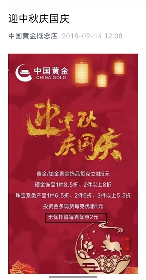 2018年,涉事門店的公眾號(hào)仍在宣傳無憂托管業(yè)務(wù),消費(fèi)者質(zhì)疑中國黃金方面,為何沒有發(fā)現(xiàn)這家店經(jīng)營公司禁止的業(yè)務(wù)/受訪者供圖