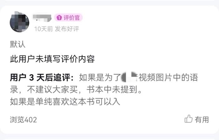 例如,在余華《我們生活在巨大的差距里》這本書的購(gòu)買評(píng)論里,有人就提到,“如果是為了視頻圖片中的語(yǔ)錄,不建議大家購(gòu)買,書本中未提到?!?/p>