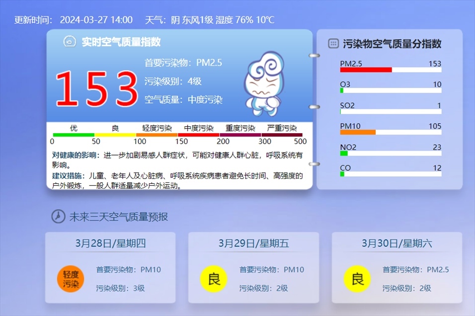 建議措施:兒童、老年人及心臟病、呼吸系統(tǒng)疾病患者避免長時間、高強(qiáng)度的戶外鍛煉,一般人群適量減少戶外運(yùn)動。