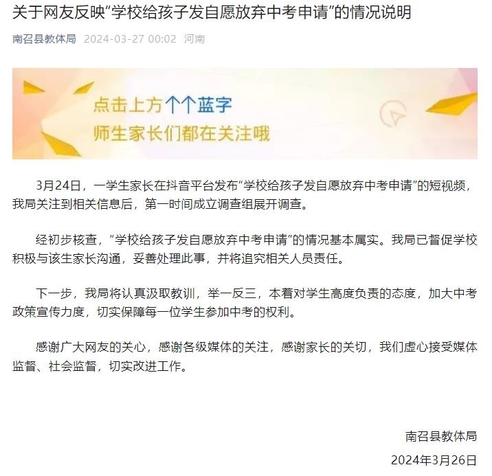 央視網(wǎng)消息:南召縣教體局3月27日發(fā)布《關(guān)于網(wǎng)友反映“學校給孩子發(fā)自愿放棄中考申請”的情況說明》。