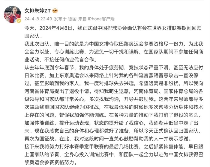 ·中國女排名將朱婷發(fā)文稱,將會(huì)在世界女排聯(lián)賽期間回歸國家隊(duì)。