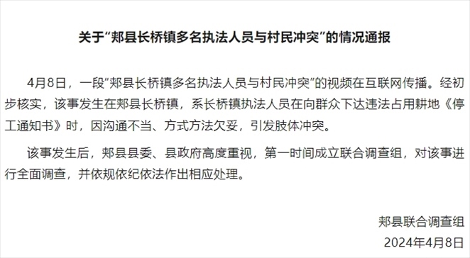 ·河南郟縣通報(bào)“多名執(zhí)法人員與村民發(fā)生沖突”:成立聯(lián)合調(diào)查組。