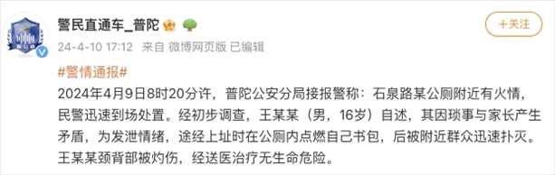 央視網消息:據@警民直通車_普陀 微博消息,4月9日8時20分許,上海普陀公安分局接報警稱:石泉路某公廁附近有火情,民警迅速到場處置。經初步調查,王某某(男,16歲)自述,其因瑣事與家長產生矛盾,為發(fā)泄情緒,途經上址時在公廁內點燃自己書包,后被附近群眾迅速撲滅。王某某頸背部被灼傷,經送醫(yī)治療無生命危險。