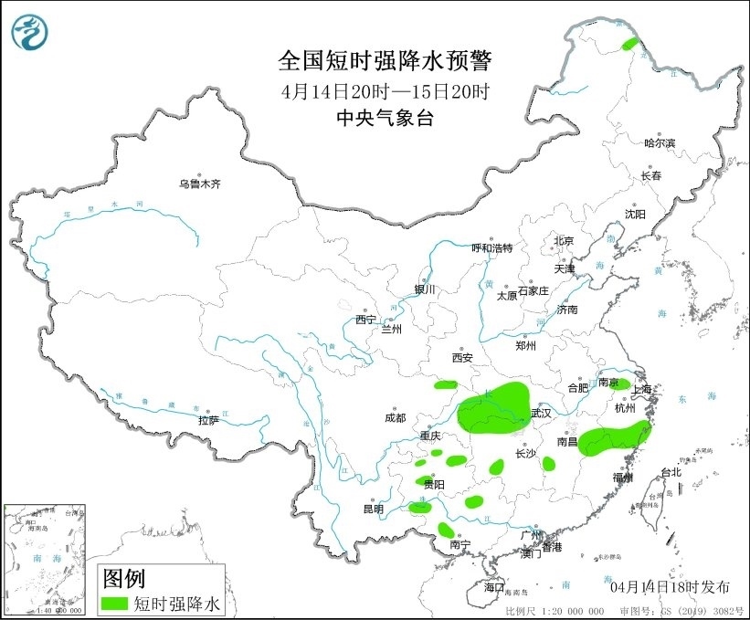 預(yù)計(jì)4月14日20時(shí)至15日20時(shí),遼寧西部、河北北部、山東東部、湖北南部和西部、湖南北部和西南部、江西東北部、浙江中南部、福建西北部、四川盆地東北部、重慶東北部、貴州中部和北部、廣西西北部等地的部分地區(qū)將有8-10級(jí)雷暴大風(fēng)或冰雹天氣;江蘇西南部、湖北中南部、湖南北部和西南部、江西西部和東北部、浙江南部、福建西北部、重慶東北部、貴州中北部、廣西西部和東北部等地的部分地區(qū)將有短時(shí)強(qiáng)降水天氣,最大小時(shí)雨量20-40毫米,局地可達(dá)50毫米以上。