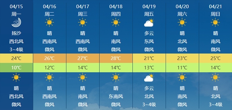 根據(jù)氣象部門預報,本周天氣以晴和多云為主,氣溫總體回升,周四白天最高氣溫預計將達到28℃。天氣條件總體適宜出行,晝夜溫差仍較大,還需注意適時增減衣物,謹防感冒。