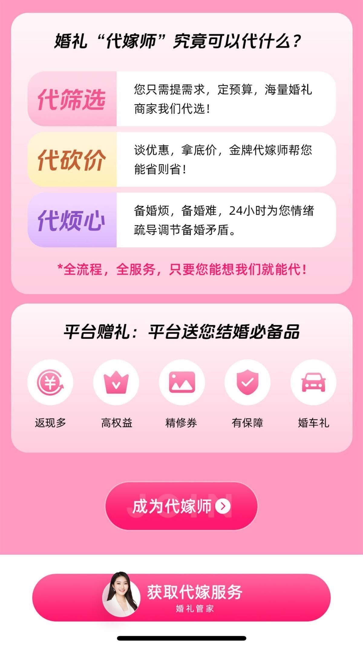 該頁面還宣傳稱,代嫁師可以“代篩選”“代砍價”“代煩心”,并且還有一行字強調(diào):“全流程,全服務,只要您能想,代嫁師就能代。”
