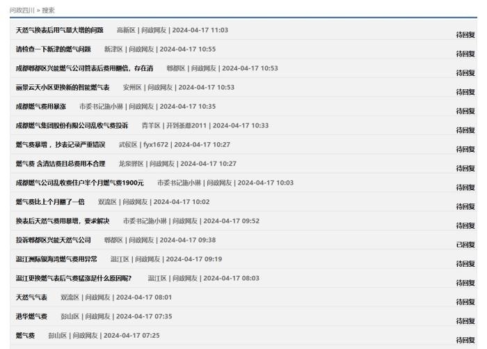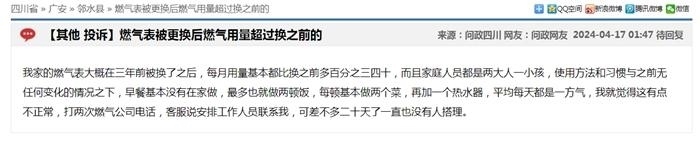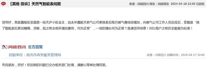 中新網(wǎng)4月17日電(中新財經(jīng)記者 吳濤)近日,在“問政四川”平臺上,不少網(wǎng)友反映“更換新表后燃?xì)赓M異常上漲”,這些留言顯示來自四川成都、自貢、廣安、南充等多地,僅僅在4月16日,保守估計就有十幾條;17日上午又出現(xiàn)十幾條。大部分尚未得到回復(fù),部分獲得官方回復(fù)稱“留言已轉(zhuǎn)交給相關(guān)機構(gòu)進行處理”。