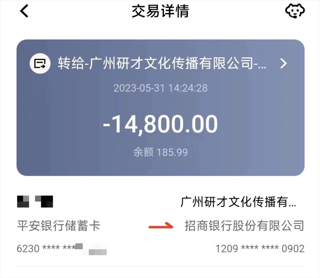 陳鑫說(shuō),為了提升未來(lái)工作機(jī)會(huì),他一直都有考研的計(jì)劃。2023年5月,他通過(guò)社交平臺(tái)得知了廣州研才教育機(jī)構(gòu)的考研輔導(dǎo)服務(wù)?!白稍兊臅r(shí)候,招生老師說(shuō)他們機(jī)構(gòu)和很多學(xué)校都有深度合作,可以承諾筆試保過(guò),通過(guò)率高達(dá)98%以上,面試只要配合導(dǎo)師走個(gè)過(guò)場(chǎng)即可,保證考上理想學(xué)校。”