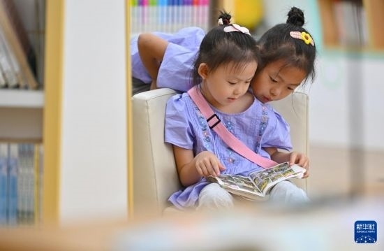 5月2日,家長帶著孩子在位于??谑械暮D鲜D書館讀書。