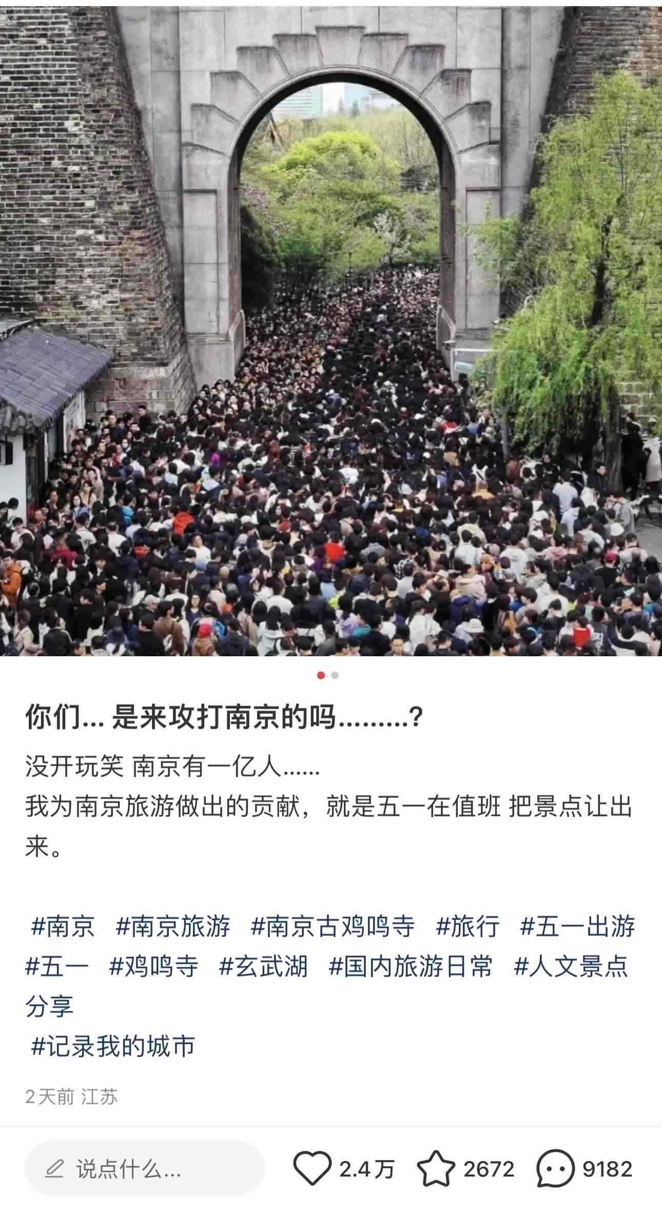 某定位顯示南京的網(wǎng)友表示:“我為南京旅游作出的貢獻(xiàn),就是五一在值班,把景點讓出來?!?/p>