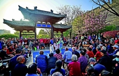 眾多市民圍觀欣賞秦腔愛好者的表演。