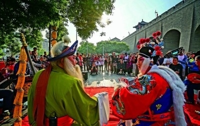 在西安文昌門外,秦腔愛好者表演秦腔折子戲《蘇武牧羊》。