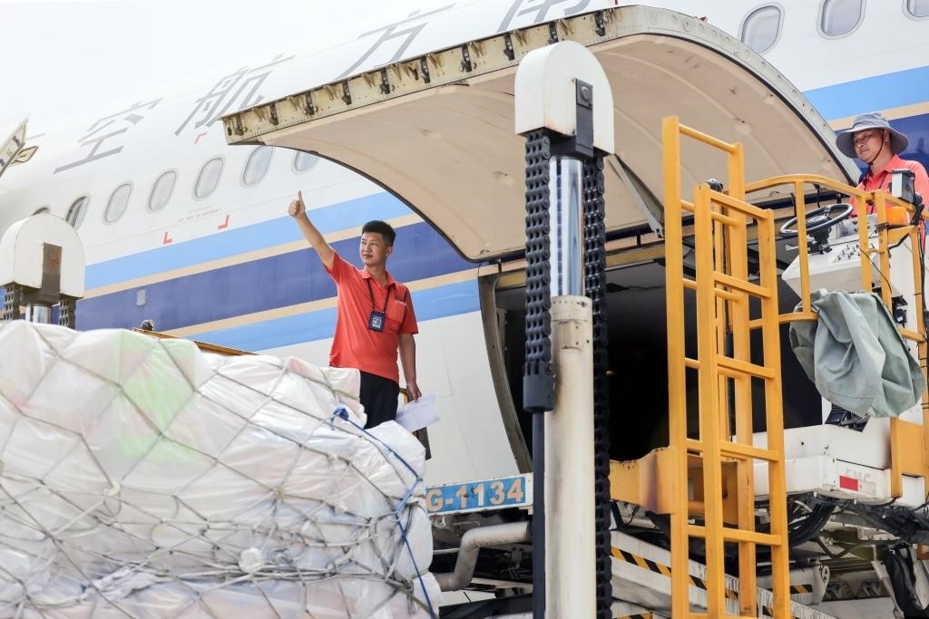 2024年“五一”期間,廣州白云機(jī)場(chǎng),南航裝卸員侯華偉與同事一起裝載航班行李和貨物。(南航供圖)