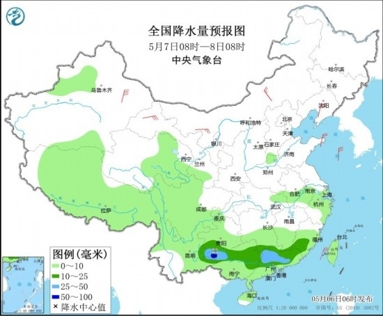 5月7日08時至8日08時,云南東部、貴州南部、湖南南部、江西南部、福建南部、廣西北部、廣東北部等地部分地區(qū)有中到大雨,其中,廣西西北部局地有暴雨(50~80毫米)。內蒙古中西部、遼東半島、甘肅河西、山東半島、新疆東部等地部分地區(qū)有4~6級風,其中,新疆東部部分地區(qū)有6~7級風。渤海海峽、黃海大部海域、東海東北部海域海域將有5~6級、陣風7級的風。