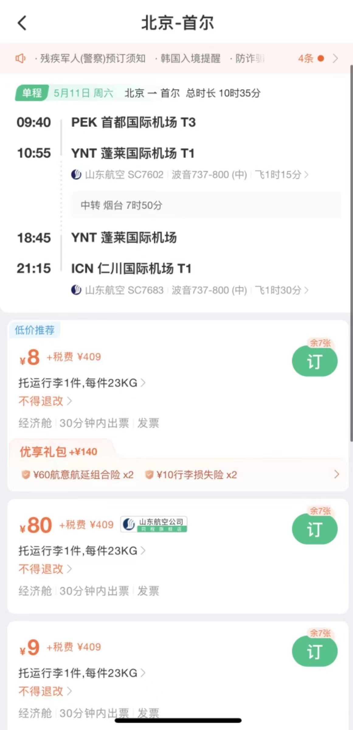 在線旅行平臺顯示,5月11日北京飛往首爾的一趟航班機票(不含稅)價格低至8元。加上稅費之后價格是417元。