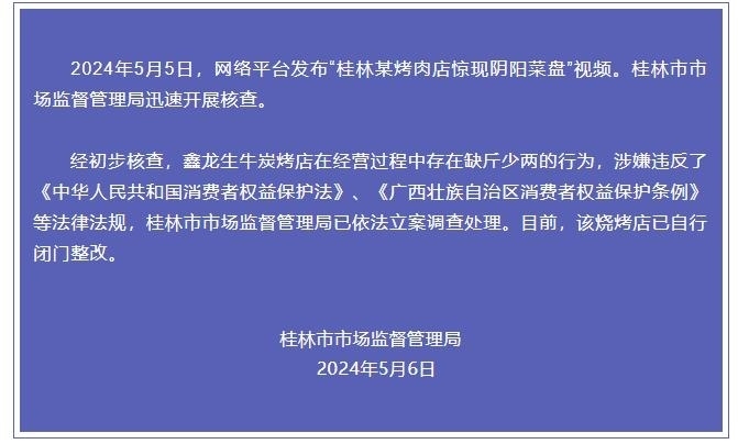 經(jīng)初步核查,鑫龍生牛炭烤店在經(jīng)營過程中存在缺斤少兩的行為,涉嫌違反了《中華人民共和國消費(fèi)者權(quán)益保護(hù)法》、《廣西壯族自治區(qū)消費(fèi)者權(quán)益保護(hù)條例》等法律法規(guī),桂林市市場(chǎng)監(jiān)督管理局已依法立案調(diào)查處理。目前,該燒烤店已自行閉門整改。