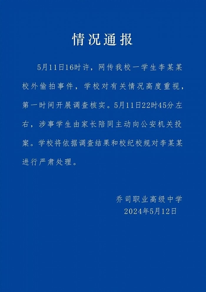 央視網(wǎng)消息:杭州市喬司職業(yè)高級中學(xué)5月12日發(fā)布情況通報(bào),5月11日16時(shí)許,網(wǎng)傳我校一學(xué)生李某某校外偷拍事件,學(xué)校對有關(guān)情況高度重視,第一時(shí)問開展調(diào)查核實(shí)。5月11日22時(shí)45分左右,涉事學(xué)生由家長陪同主動向公安機(jī)關(guān)投案。學(xué)校將依據(jù)調(diào)查結(jié)果和校紀(jì)校規(guī)對李某某進(jìn)行嚴(yán)肅處理。