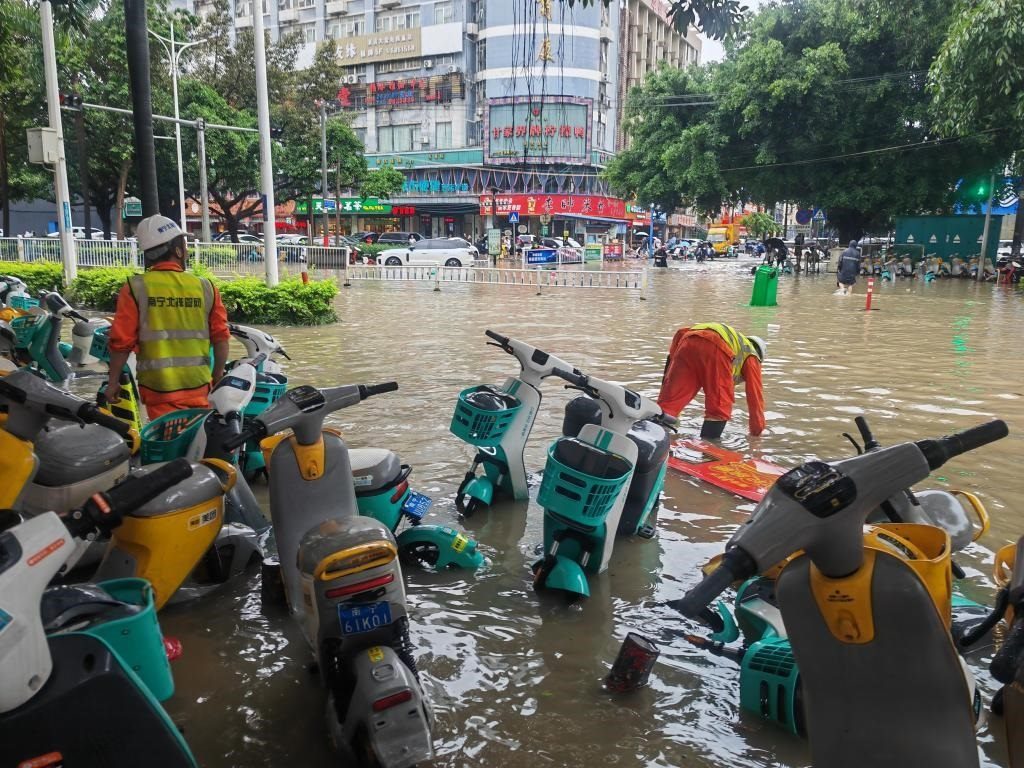 受暴雨影響,南寧市部分城區(qū)發(fā)生內(nèi)澇,一些低洼地帶積水較深。記者在南寧市青秀區(qū)東葛路一帶看到,一些地方積水深度為0.5米左右,不少電動自行車側(cè)倒在馬路兩邊,有數(shù)輛小汽車熄火停在路中間。一名群眾告訴記者,19日凌晨3時左右突降暴雨,大量雨水灌入地勢較低的地下車庫,一些來不及轉(zhuǎn)移的車輛被淹。