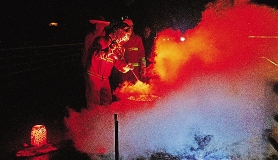 表演結(jié)束,取出上千攝氏度的坩堝準備滅火。