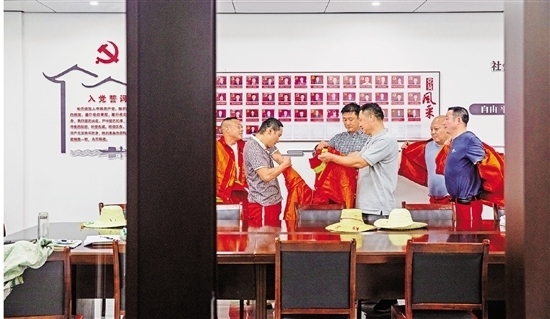在清湖一村村委會會議室,“打鐵花小隊”邊脫防護服邊交流經(jīng)驗。