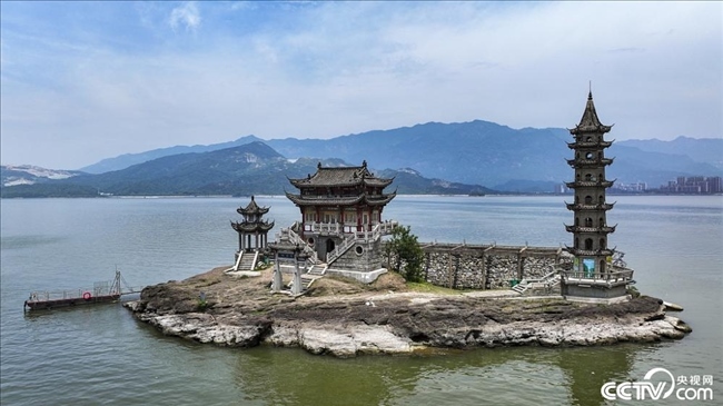 江西鄱陽湖進(jìn)入豐水期,位于江西省廬山市境內(nèi)的鄱陽湖標(biāo)志性景觀落星墩,隱入湖中成為“水中樓閣”。