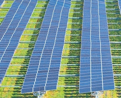 億利立體生態(tài)光伏項(xiàng)目區(qū),光伏面板下長出牧草。
