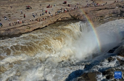 近日,受降雨影響,黃河壺口瀑布水量增大,河水翻滾而下,飛濺起的水霧在陽(yáng)光的照射下,形成“彩橋通天”景觀。