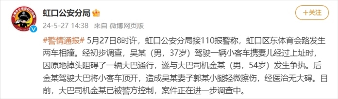央視網(wǎng)消息:上海市公安局虹口分局發(fā)布警情通報(bào),5月27日8時(shí)許,虹口公安分局接110報(bào)警稱,虹口區(qū)東體育會路發(fā)生兩車相撞。經(jīng)初步調(diào)查,吳某(男,37歲)駕駛一輛小客車攜妻兒經(jīng)過上址時(shí),因原地掉頭阻礙了一輛大巴通行,遂與大巴司機(jī)金某(男,54歲)發(fā)生爭執(zhí)。后金某駕駛大巴將小客車頂開,造成吳某妻子郭某小腿輕微擦傷,經(jīng)醫(yī)治無大礙。目前,大巴司機(jī)金某已被警方控制,案件正在進(jìn)一步調(diào)查中。