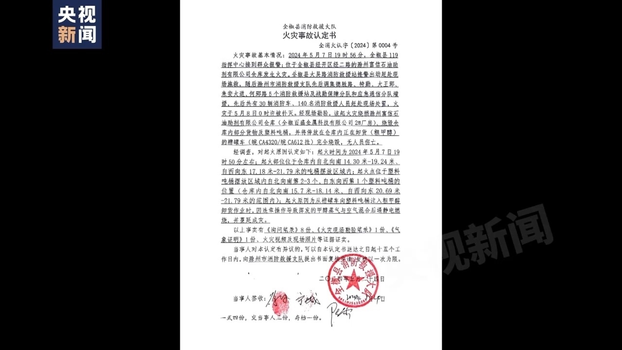 記者從全椒縣消防救援大隊(duì)于5月24日出具的火災(zāi)事故認(rèn)定書(shū)上發(fā)現(xiàn),5月7日晚上7點(diǎn)多,滁州富信助劑有限公司倉(cāng)庫(kù)發(fā)生火災(zāi),滁州市消防救援支隊(duì)調(diào)集30輛消防車(chē)、140名消防救援人員現(xiàn)場(chǎng)處置,火災(zāi)于5月8日0時(shí)許撲滅。經(jīng)現(xiàn)場(chǎng)勘驗(yàn),該起火災(zāi)燒損滁州富信石油助劑有限公司倉(cāng)庫(kù)、燒毀倉(cāng)庫(kù)內(nèi)部分貨物及塑料噸桶,并將停放在倉(cāng)庫(kù)內(nèi)正在卸粗甲醇的槽罐車(chē)完全燒毀,無(wú)人員傷亡。