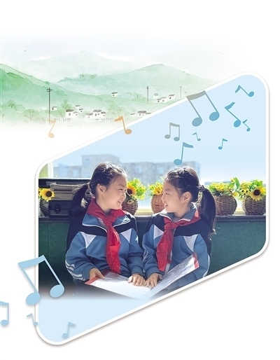講臺上,隨著廖光新的雙手向前一打開,學(xué)生們齊刷刷地唱了起來?!敖裉焯鞖夂?,去找嘎嘎(外婆)嘍……”稚嫩而清脆的聲音瞬間充滿整個教室,透過窗戶傳向遠處的大山。