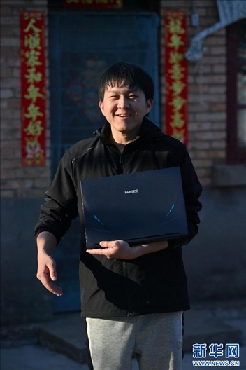 在柳州市鷓鴣江路附近一處出租屋外,熊三耶在展示剛剛購買的筆記本電腦(2024年2月11日攝)。新華社記者 黃孝邦 攝