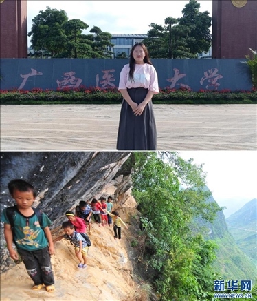 拼版照片:上圖為2023年5月27日,22歲的蒙秋艷站在廣西醫(yī)科大學(xué)校門口。
