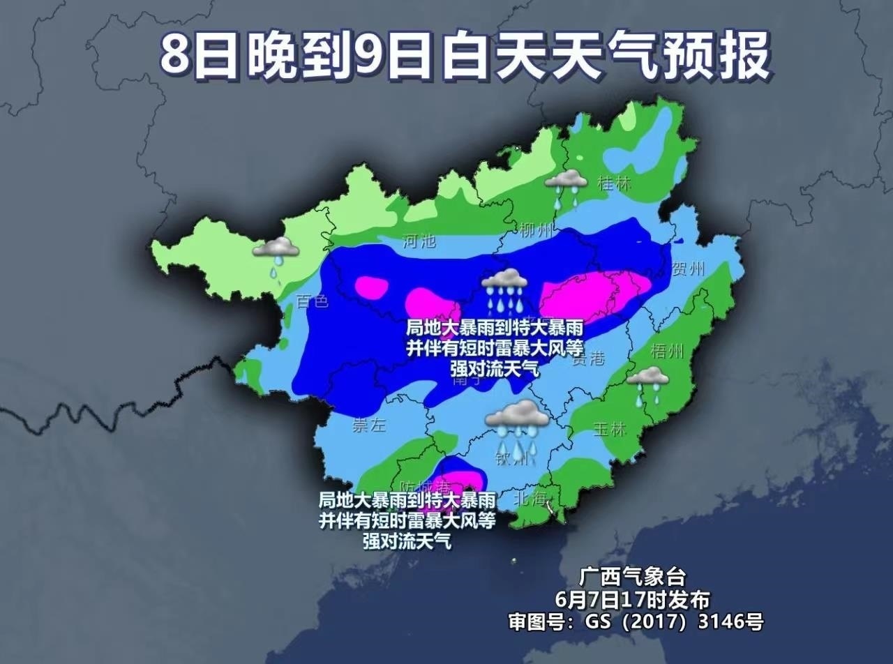 8日晚上到9日白天,雨勢升級,并進入此輪降雨的最強階段,強降雨的范圍也將進一步擴大,廣西全區(qū)有大雨到暴雨,局地有大暴雨到特大暴雨,并伴有短時雷暴大風等強對流天氣。