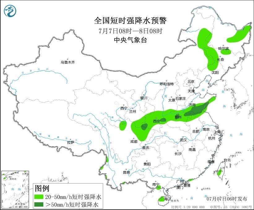 預計7月7日08時至8日08時,內(nèi)蒙古東北部、黑龍江東北部和西南部、吉林北部、青海東南部、甘肅東南部、陜西南部、山西西南部、山東南部、河南中部、安徽北部、江蘇北部、四川北部、重慶西部等地的部分地區(qū)將有8級以上雷暴大風或冰雹天氣,其中,山東南部、河南東部、安徽北部、江蘇北部等地的部分地區(qū)將有10級以上雷暴大風,最大風力可達11級以上;內(nèi)蒙古東部、黑龍江中東部、吉林中西部、遼寧北部、甘肅東南部、陜西中南部、山西南部、山東中南部、河南中北部、安徽北部、江蘇北部、四川北部、海南島西北部、臺灣島西南部等地的部分地區(qū)將有小時雨量大于20毫米的短時強降水天氣,其中,陜西東南部、山東南部、河南中部、江蘇北部、四川盆地西北部等地的部分地區(qū)將有小時雨量大于50毫米,最大可達70毫米以上。