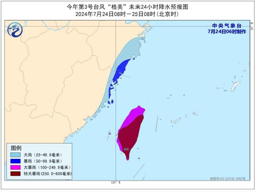 降水預(yù)報:7月24日08時至25日08時,浙江東南部、福建東部將有大到暴雨,臺灣島有大暴雨,部分地區(qū)特大暴雨(250-600毫米)。