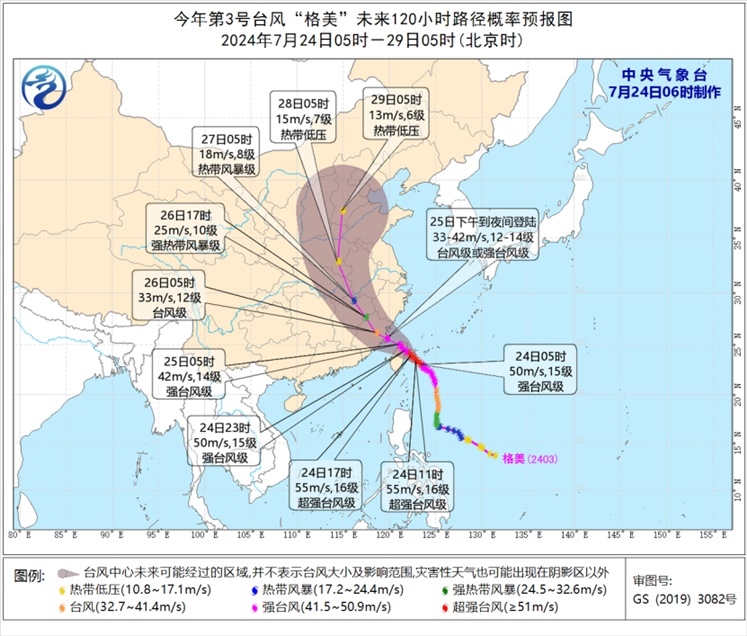 預(yù)計,“格美”將以每小時10-15公里的速度向西北方向移動,強(qiáng)度逐漸增強(qiáng),最強(qiáng)可達(dá)超強(qiáng)臺風(fēng)級(52-58米/秒,16-17級),并將于24日晚上在臺灣島中北部沿海登陸(強(qiáng)臺風(fēng)級,14-15級,45-50米/秒)。之后穿過臺灣島,將于25日下午到夜間在福建福鼎到晉江一帶沿海登陸(臺風(fēng)級或強(qiáng)臺風(fēng)級,12-14級,33-42米/秒)。然后深入內(nèi)陸北上,強(qiáng)度逐漸減弱。