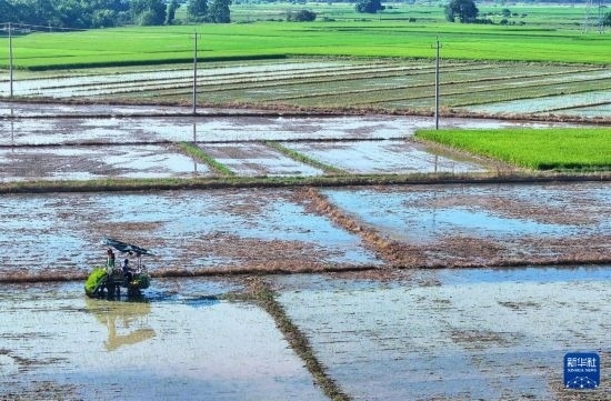 8月3日,衡東縣草市鎮(zhèn)村民駕駛農(nóng)機(jī)開展晚稻插秧工作(無人機(jī)照片)。