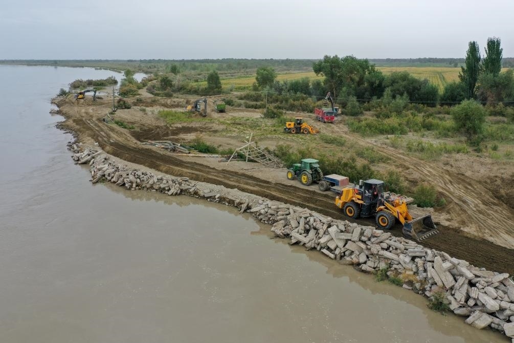 2024年8月3日,在新疆阿克蘇地區(qū)沙雅縣蓋孜庫木鄉(xiāng)吐央村,搶險人員駕駛大型機(jī)械進(jìn)行堤壩加固(無人機(jī)照片)。新華社記者 丁磊 攝