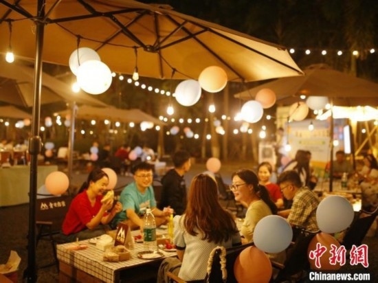 活動(dòng)現(xiàn)場(chǎng),搭建了露營帳篷、休閑桌椅一字排開,布置了彩色氣球,提供甜品、水果、飲料等,燈光閃爍、晚風(fēng)習(xí)習(xí),氛圍甜蜜而浪漫。