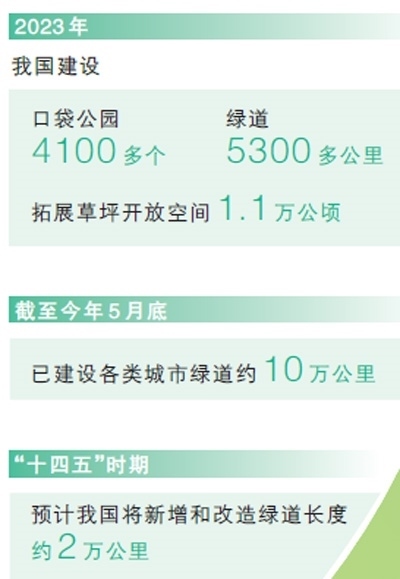 我國(guó)將綠色發(fā)展理念融入城鄉(xiāng)規(guī)劃建設(shè)管理中,穩(wěn)步推進(jìn)建設(shè)連通區(qū)域、城市、社區(qū)的城鄉(xiāng)綠道體系。2023年,我國(guó)建設(shè)口袋公園4100多個(gè)、綠道5300多公里,拓展草坪開(kāi)放空間1.1萬(wàn)公頃,截至今年5月底,已建設(shè)各類(lèi)城市綠道約10萬(wàn)公里。