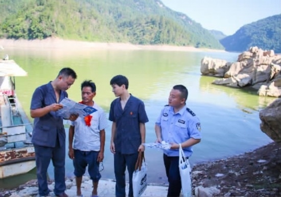 圖③:干警向兩岸過(guò)渡村民發(fā)放普法資料,并提醒他們乘船時(shí)注意安全。
