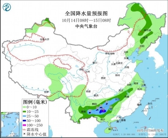 10月14日8時(shí)至15日8時(shí),東北地區(qū)西部、云南東部、貴州南部、廣西中北部、湖南中部和西部、江西西北部等地部分地區(qū)有中到大雨,其中,云南東部、貴州南部、廣西北部、湖南西南部等地部分地區(qū)有暴雨或大暴雨(100~120毫米)。內(nèi)蒙古東北部、黑龍江西北部、新疆北部高海拔山區(qū)有中到大雪,局地暴雪。內(nèi)蒙古中部和北部、東北地區(qū)等地部分地區(qū)有5~6級(jí)風(fēng),陣風(fēng)7~8級(jí)。