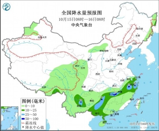 10月15日8時(shí)至16日8時(shí),云南東北部、貴州東南部、廣西大部、湖南中部、江西中部、浙江大部等地部分地區(qū)有中到大雨,其中,湖南西部、江西中部、浙江西部等地局部地區(qū)有暴雨(50~70毫米)。青海南部、西藏東部、四川西部等地有小到中雪或雨夾雪。