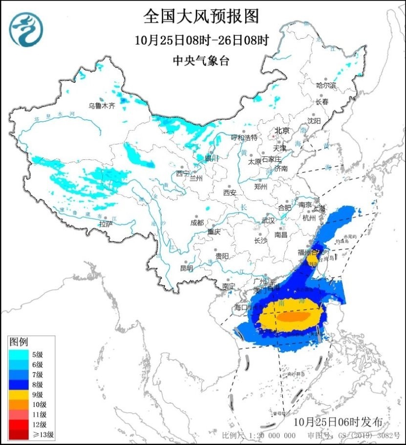 未來24小時,東海西部海域、臺灣海峽、南海北部和中部海域、巴士海峽、東沙群島、中沙群島、西沙群島將有7~9級、陣風10~11級的大風,其中南海中東部的部分海域風力可達10級、陣風11~12級。